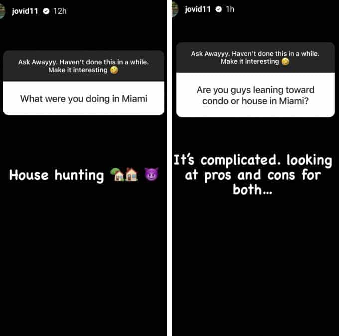 When asked, “What were you doing in Miami,” Jovi responded, “House hunting ???.”