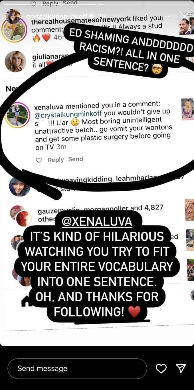 The follower mentioned Crystal in the comments of a post. They called the Beverly Hills Housewife a liar before making a racist remark that also shamed eating disorders.